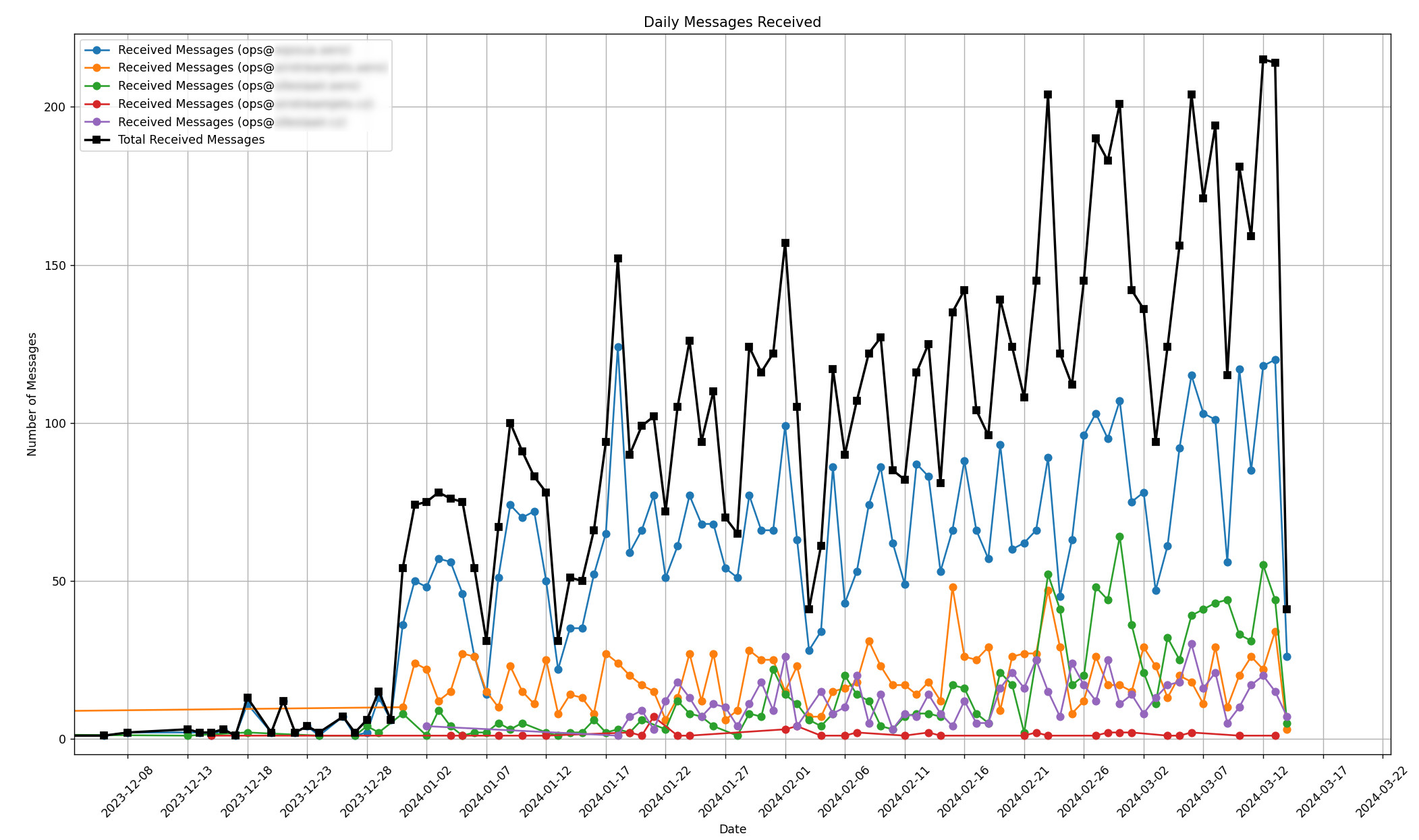Pro představu zde je počet příchozích zpráv do všech 5ti schránek týmu OPS: