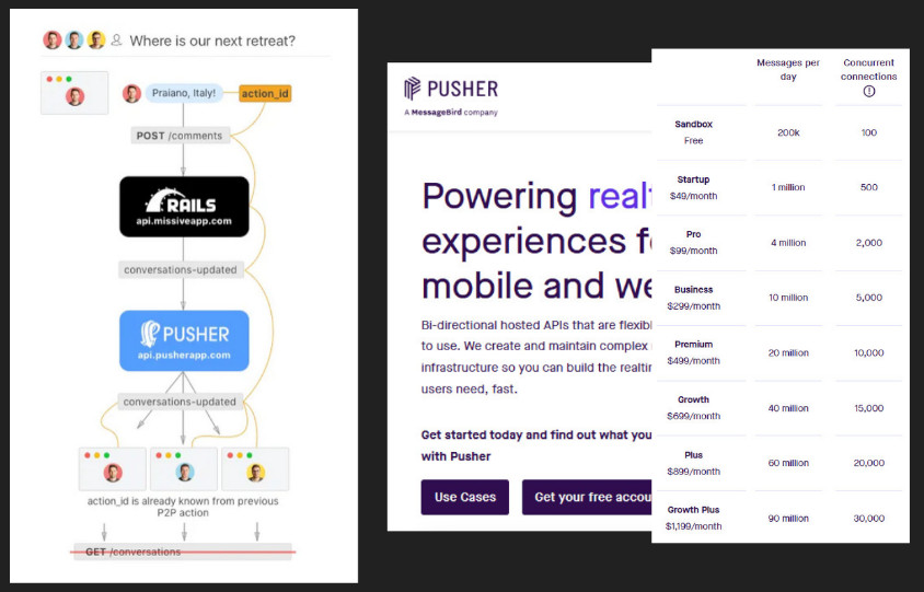 Celé řešení je podrobně popsáno zde. Snad jen ve stručnosti: Missive má RESTful API a připojení klienti posílají převážně GET requesty. Změny stavu (včetně např. psaní draftu kdy opravdu vidíte "naskakování" textu po písmenech / slovech) se přesto propisuje v reálném čase a to vše bez použití pollingu a zahlcení vlastních serverů něčím co nápadně připomíná DDOS. Velký podíl na tom má Pusher a jeho "P2P channels". Je to elegantní, škálovatelné řešení které v praxi funguje velmi dobře. Myslím, že stejnými slovy lze vlastně popsat celý Missive.