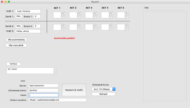Pro představu zde uvádím pouze jeden ovladací interface vytvořený speciálně pro šampionát ve squashi. Tento ovládací klient je zajímavý především automatizovaným načítám dat o hráčích a score.